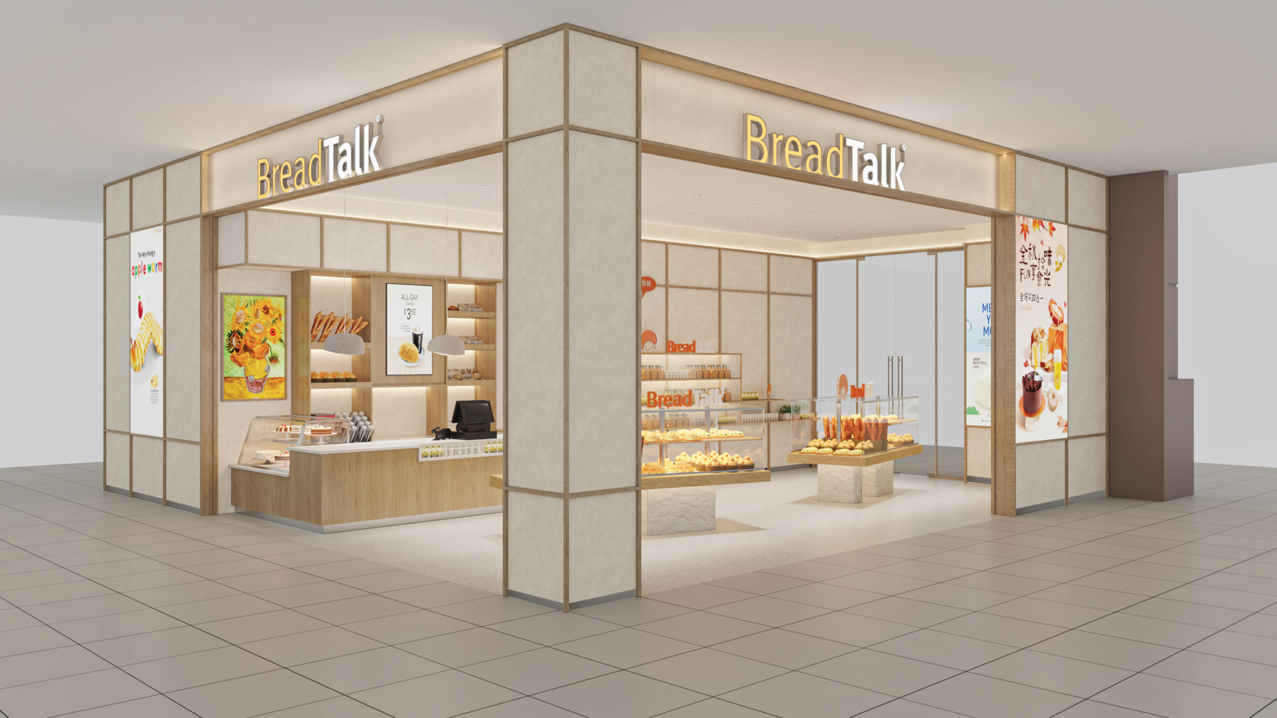 Emphasizing its boutique bakery concept, each BreadTalk store is literally a bread shopping haven where each product tells a story. Be it a chef’s or baker’s own inspiration, the workings of politics or society’s trends, BreadTalk’s ‘Earthquake Cheese’, ‘Mr. Beans’, ‘Crouching Tiger, Hidden Bacon’ are just some of the breads that have brought real stories to life. Youthful names and designs, the store’s clean lines, and BreadTalk’s open kitchen all come together for a fun and sophisticated experience.